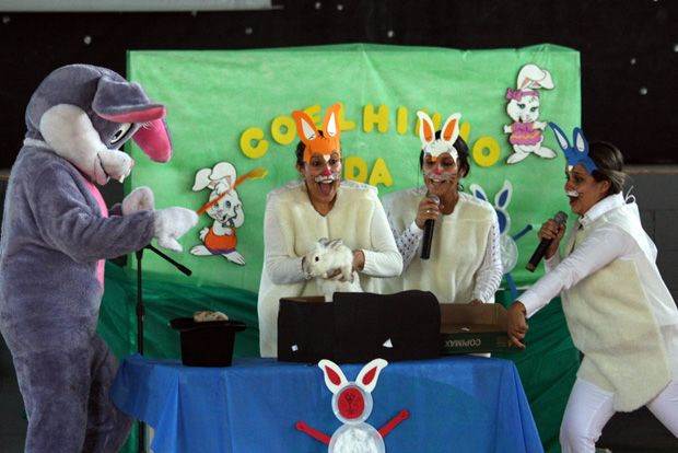 A primeira atividade, dia 11, foi uma peça teatral encenada pelas professoras do Infantil, com participação de alunos. A peça foi baseada no livro infantil “O coelhinho que não era de Páscoa”, da escritora brasileira Ruth Rocha.