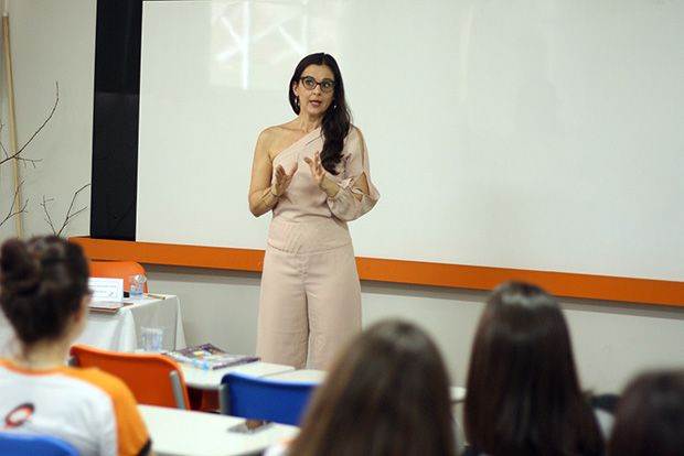 “A Lúcia Dias é uma especialista na área de Design Gráfico e tem muita coisa para partilhar conosco pela experiência, pelo dom e por ter contato com o mundo atualizado da universidade”, contou a coordenadora do Ensino Médio e do PV, professora Marcia Gil de Souza, ao apresentar a palestrante.