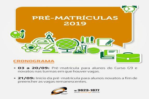 Sobre o Curso G9 – O Curso G9 iniciou suas atividades em 1995 com o Ensino Médio e o Pré-vestibular. Um ano depois, passou a oferecer o Ensino Fundamental II e, em 2007, o Ensino Fundamental I. A partir de 2009, começaram a ser implantadas as turmas de Educação Infantil: Jardim II (5 anos), Jardim I (4 anos) e Maternal II (3 anos).