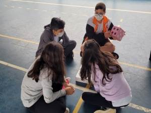 tabuleiro com materiais reciclados na aula de Língua Portuguesa, da professora